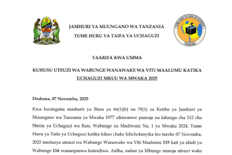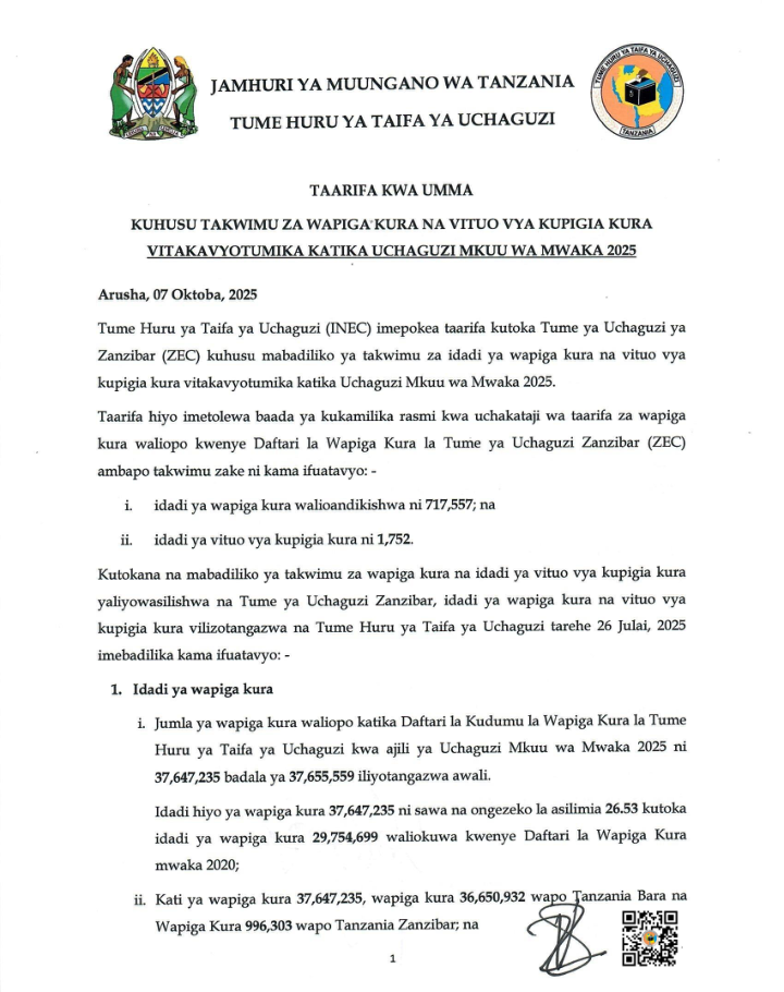 Uchaguzi Mkuu 2025 INEC YATANGAZA TAKWIMU ZA WAPIGA KURA NA VITUO VITAKAVYOTUMIKA KUPIGIA KURA UCHAGUZI MKUU 2025 Editor October 7, 2025 Updated 2025/10/07 at 7:57 PM Share SHARE You Might Also Like HAYA HAPA MAJINA 115 WABUNGE VITI MAALUM WALIOTEULIWA NA INEC UCHAGUZI MKUU 2025 WATANZANIA 37,647,235 KUPIGA KURA OKTOBA 29, 2025 INEC YAZURU WILAYA YA TANGANYIKA KUKAGUA MAANDALIZI VITUO VYA KUPIGIA KURA OMH YAWATAKA WATUMISHI WA UMMA KUSHIRIKI UCHAGUZI MKUU KIKAMILIFU INEC YATOA TAARIFA YA UCHAGUZI WA MADIWANI KATA YA MINDU,MZINGA NA KIRUA VUNJO MAGHARIBI Editor October 7, 2025 Share this Article Facebook TwitterEmail Print Previous Article NIT SASA NI KITUO RASMI CHA MAFUNZO NA MITIHANI YA LESENI ZA KIMATAIFA WAHANDISI MATENGENEZO YA NDEGE Next Article MWENGE WA UHURU WAZINDUA KIWANDA CHA KUCHENJUA DHAHABU CHUNYA Leave a comment Leave a Reply Cancel replyYour email address will not be published. Required fields are marked *Comment * Name * Email * Website Save my name, email, and website in this browser for the next time I comment. Stay Connected Facebook Like Twitter Follow Youtube Subscribe Telegram Follow - Advertisement - Latest News HAYA HAPA MAJINA 115 WABUNGE VITI MAALUM WALIOTEULIWA NA INEC UCHAGUZI MKUU 2025 Uchaguzi Mkuu 2025 MWANASHERIA MKUU WA SERIKALI AFAFANUA UHALALI WA UCHAGUZI MKUU 2025 Kitaifa TAASISI ZA MADINI ZAELEZA MAFANIKIO ROBO YA KWANZA 2025/26 Madini Mchanganyiko TMA:KIMBUNGA CHENGE KIMESAMBARATIKA Hali ya Hewa