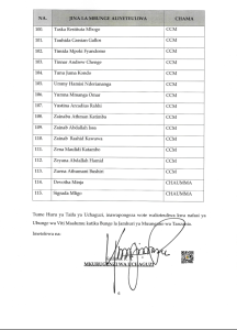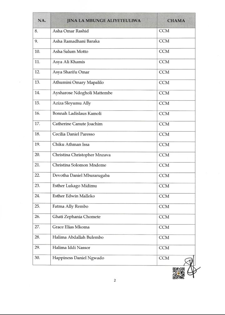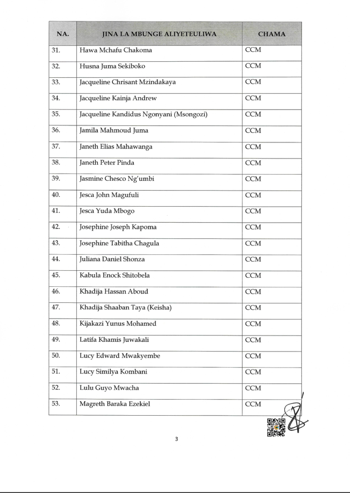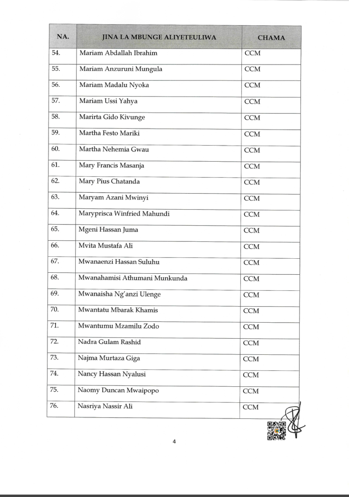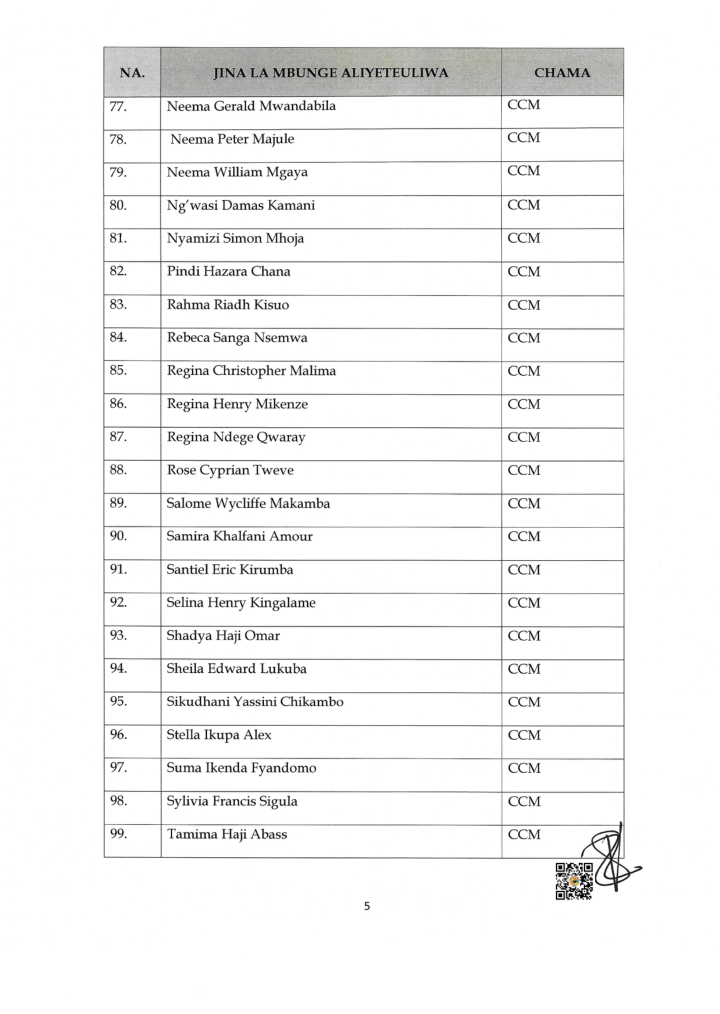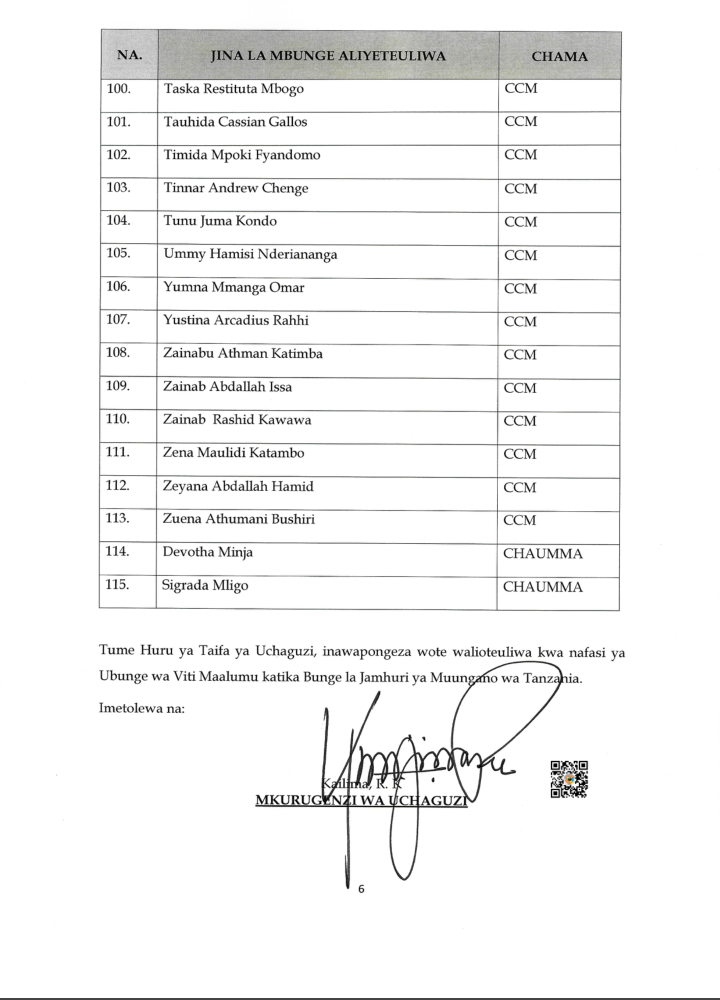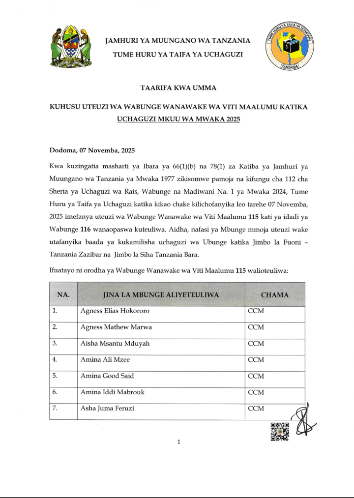 Uchaguzi Mkuu 2025 HAYA HAPA MAJINA 115 WABUNGE VITI MAALUM WALIOTEULIWA NA INEC UCHAGUZI MKUU 2025 Editor November 7, 2025 Updated 2025/11/07 at 3:44 PM Share SHARE You Might Also Like WATANZANIA 37,647,235 KUPIGA KURA OKTOBA 29, 2025 INEC YAZURU WILAYA YA TANGANYIKA KUKAGUA MAANDALIZI VITUO VYA KUPIGIA KURA OMH YAWATAKA WATUMISHI WA UMMA KUSHIRIKI UCHAGUZI MKUU KIKAMILIFU INEC YATOA TAARIFA YA UCHAGUZI WA MADIWANI KATA YA MINDU,MZINGA NA KIRUA VUNJO MAGHARIBI INEC YATOA TAARIFA YA MAELEKEZO YA KISERA UCHAGUZI MKUU 2025 Editor November 7, 2025 Share this Article Facebook TwitterEmail Print Previous Article MWANASHERIA MKUU WA SERIKALI AFAFANUA UHALALI WA UCHAGUZI MKUU 2025 Leave a comment Leave a Reply Cancel replyYour email address will not be published. Required fields are marked *Comment * Name * Email * Website Save my name, email, and website in this browser for the next time I comment. Stay Connected Facebook Like Twitter Follow Youtube Subscribe Telegram Follow - Advertisement - Latest News HAYA HAPA MAJINA 115 WABUNGE VITI MAALUM WALIOTEULIWA NA INEC UCHAGUZI MKUU 2025 Uchaguzi Mkuu 2025 MWANASHERIA MKUU WA SERIKALI AFAFANUA UHALALI WA UCHAGUZI MKUU 2025 Kitaifa TAASISI ZA MADINI ZAELEZA MAFANIKIO ROBO YA KWANZA 2025/26 Madini Mchanganyiko TMA:KIMBUNGA CHENGE KIMESAMBARATIKA Hali ya Hewa